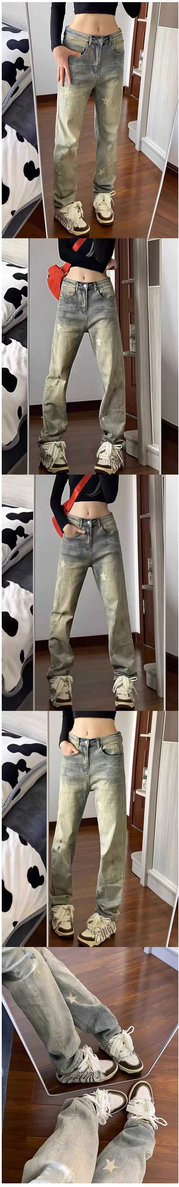 熱賣美式vibe復古水洗星星黃泥牛仔褲女國潮高街hiphop寬鬆直筒褲(下單後聯絡客服確認發貨尺碼)