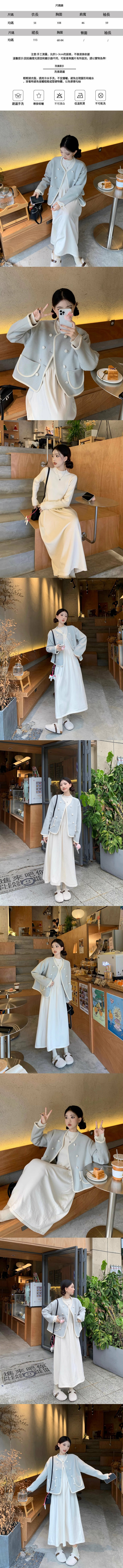 熱賣米杏色針織連衣裙+淺藍色毛呢上衣兩件套(均碼)