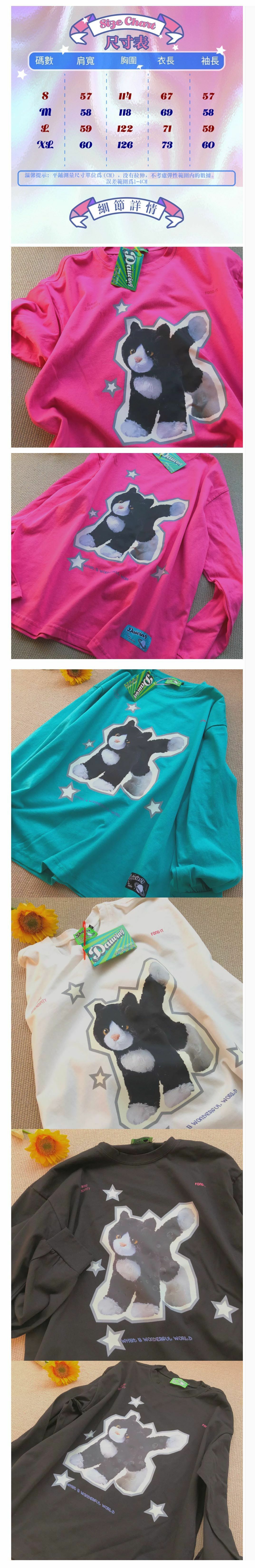 熱賣貓公仔卡通情侶棉麻長袖T恤【湖藍】【S-XL碼】(下單後請聯絡客服確認發貨尺碼)