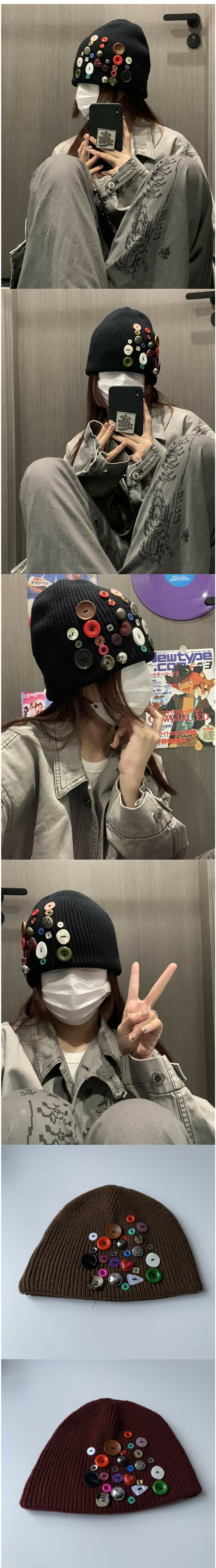 熱賣五彩紐扣針織帽保暖時尚毛線帽(均碼米黃色)