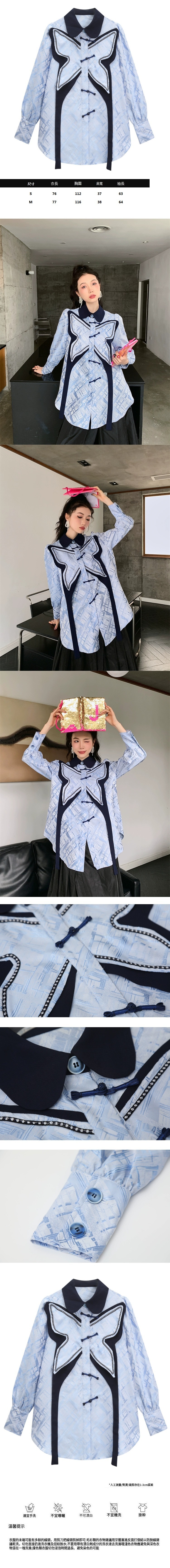 熱賣盤扣撞色大蝴蝶結襯衫(藍色)(S-L碼)(下單後聯絡客服確認發貨尺碼)