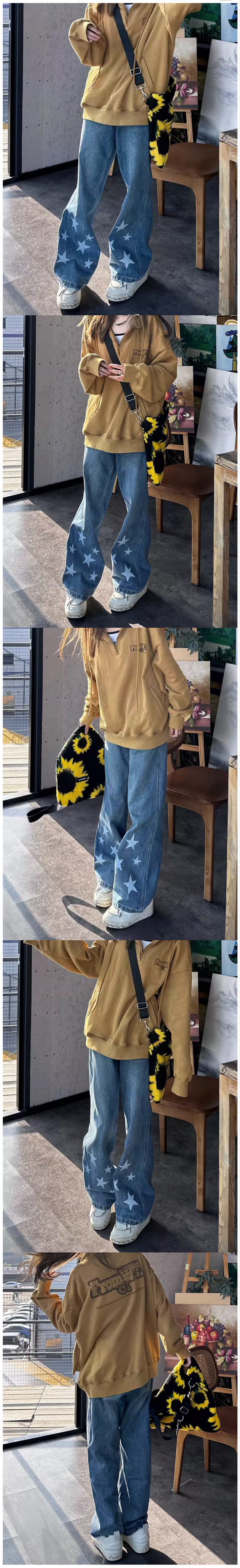 熱賣設計感小眾星星印花牛仔褲女美式復古高腰寬鬆直筒闊腿褲ins潮牌(下單後聯絡客服確認發貨尺碼)