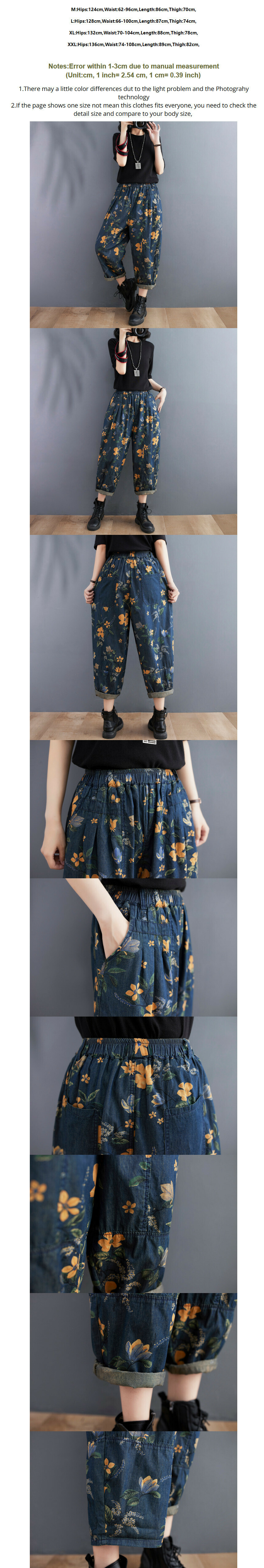 熱賣彈力腰寬鬆休閒小腿長褲花朵印花復古牛仔褲 P123(M-XXL碼)(下單後請聯絡客服確認發貨尺碼)