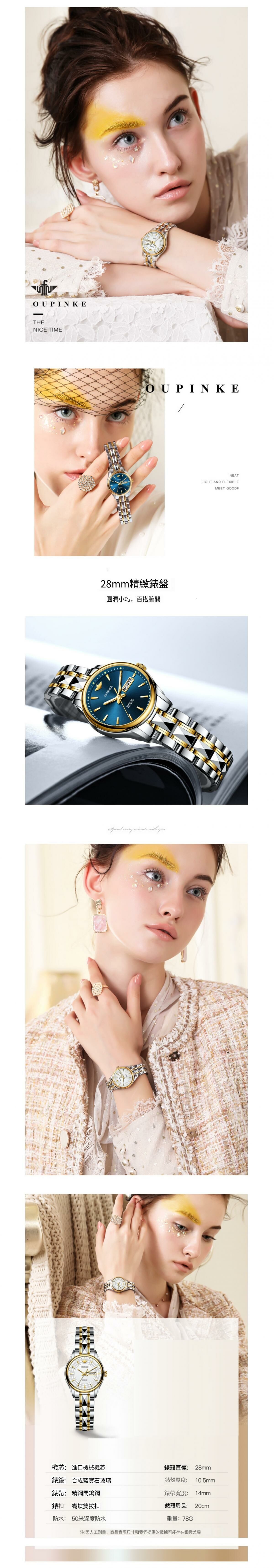 熱賣歐品客全自動機械錶女士手錶(鋼帶間白女)