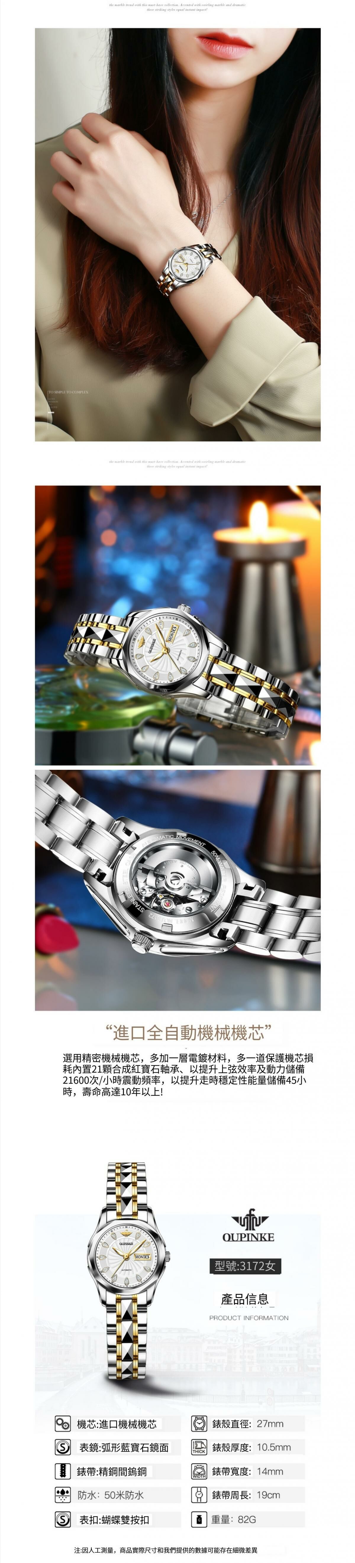 熱賣歐品客防水自動機械錶簡約氣質女士手錶(鋼帶本藍女)