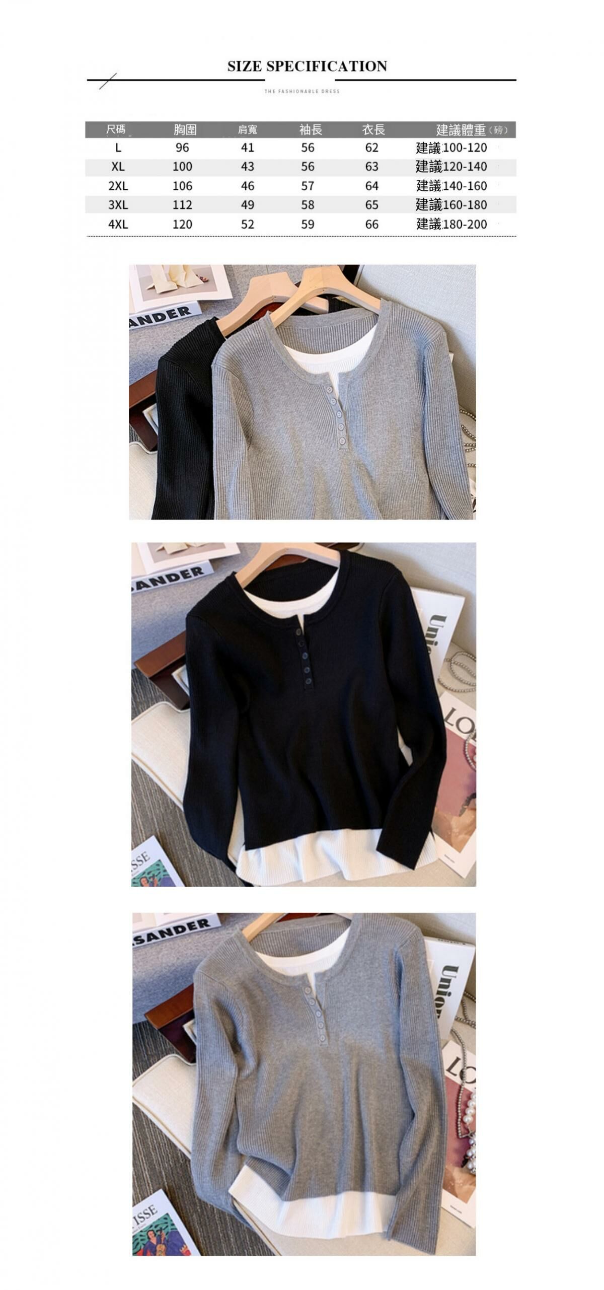 熱賣假兩件長袖針織衫【灰色】【L-4XL碼】(下單後請聯絡客服確認發貨尺碼)