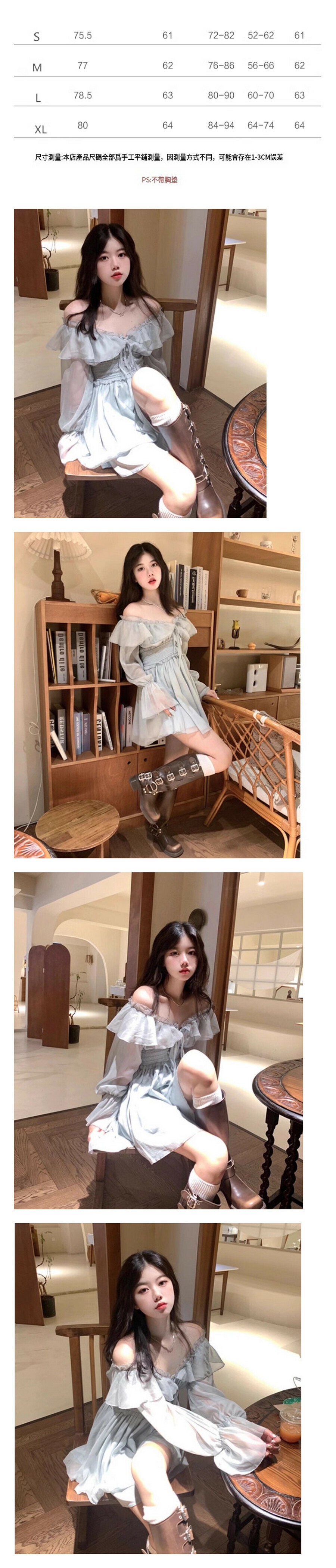 熱賣法式一字肩長袖連衣裙【水藍色】尺碼【S碼—XL碼】【下單後請聯絡客服確認發貨尺碼】