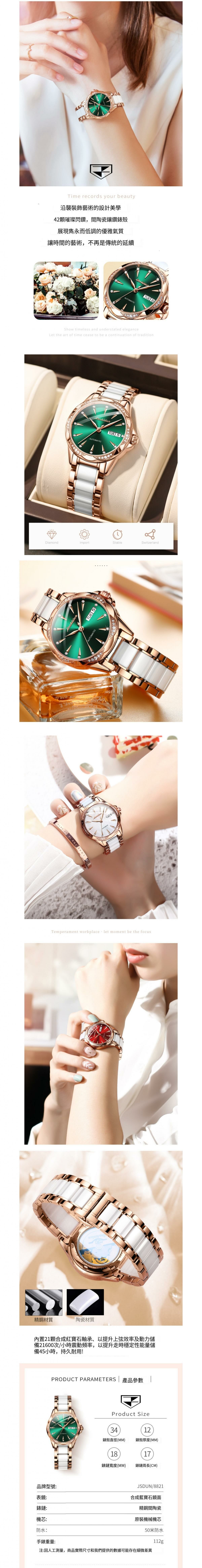 熱賣金仕盾鑲鑽陶瓷鋼帶防水女士手錶(陶瓷帶玫殼綠面女)