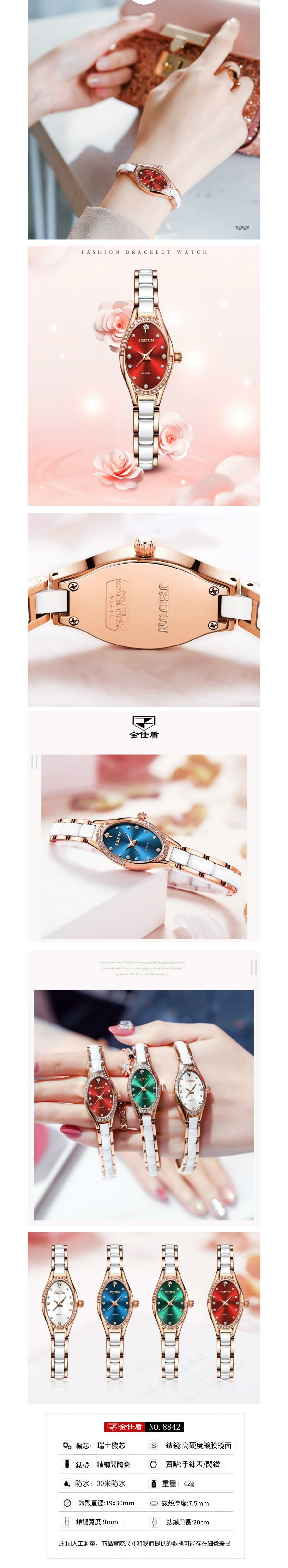 熱賣金仕盾石英機芯防水女士手錶(陶瓷玫殼紅面)