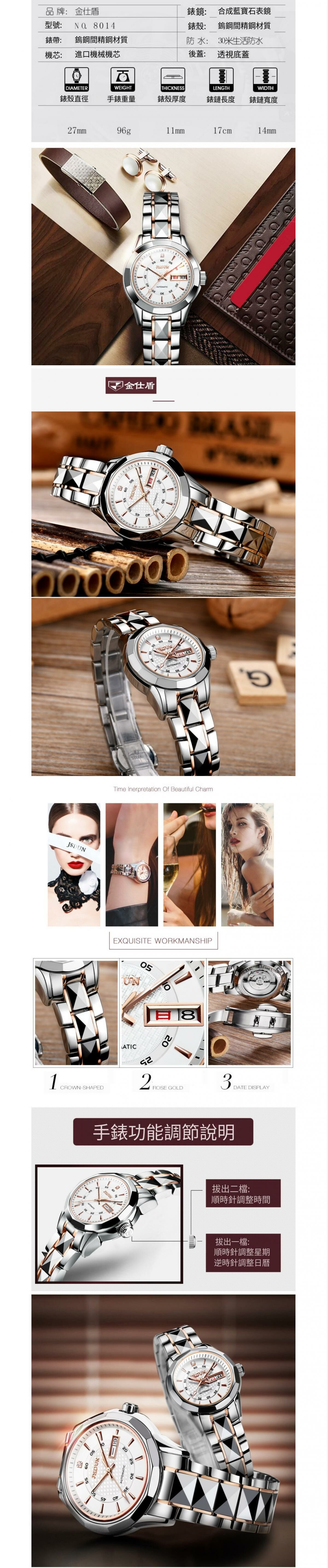 熱賣金仕盾防水機械錶雙行事曆鎢鋼女士手錶(鋼帶間白女)