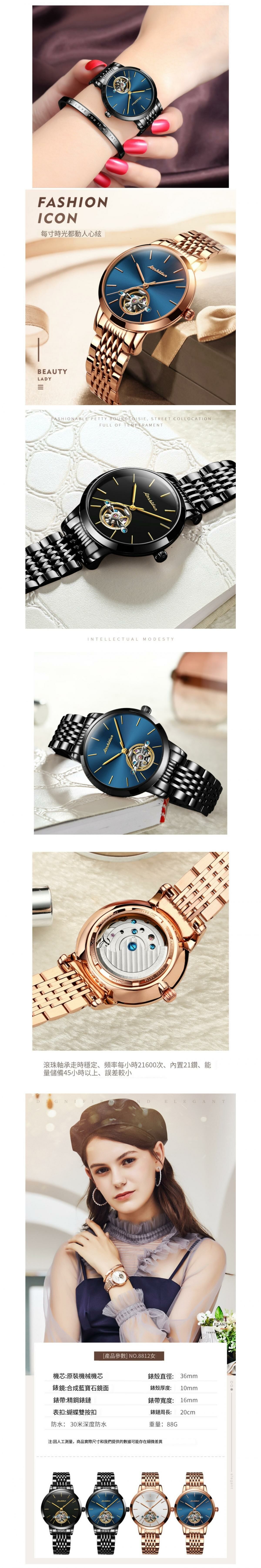熱賣金仕盾防水機械錶鏤空女士手錶(玫鋼玫殼白麵女)
