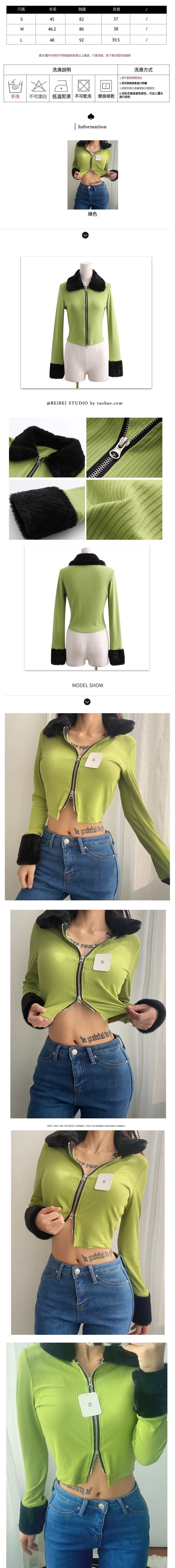 熱賣大毛領袖口雙向拉鍊短款針織衫(綠色)(S-L碼)(下單後聯絡客服確認發貨尺碼)
