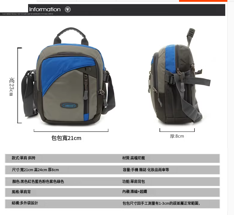 熱賣男女同款輕便單肩包 斜挎包 旅行休閒包包多功能 【藍色】