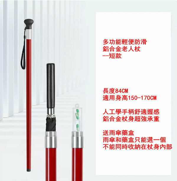 熱賣多功能鋁合金藥盒雨傘手杖--圓頭-朱紅色-短款