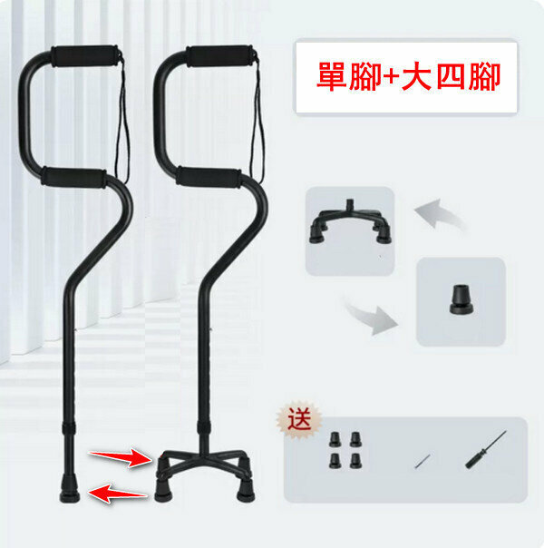熱賣多功能鋁合金伸縮老人杖-弓形大四腳+單腳-啞光黑
