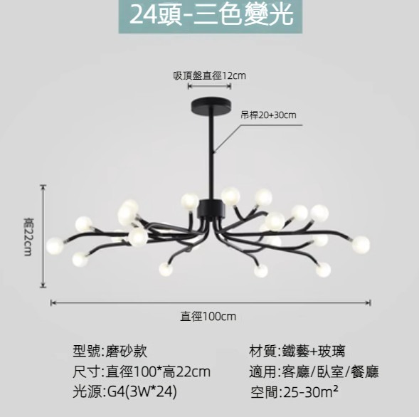 熱賣北歐簡約螢火蟲燈吊燈(黑色燈體)(磨砂款/24頭/三色變光)