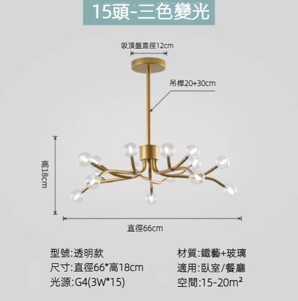 熱賣北歐簡約螢火蟲燈吊燈(金色燈體)(透明款/15頭/三色變光)