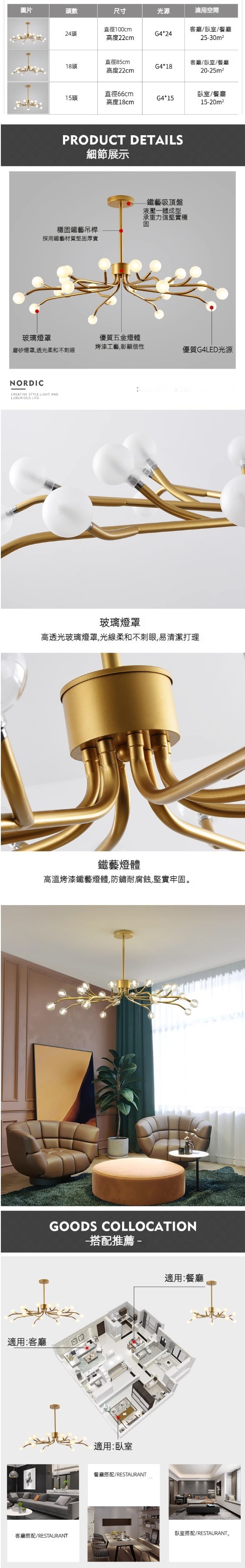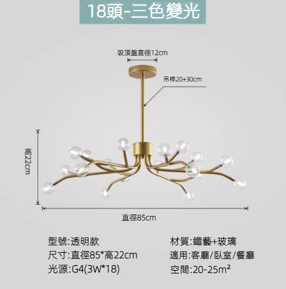 熱賣北歐簡約螢火蟲燈吊燈(金色燈體)(透明款/18頭/三色變光)