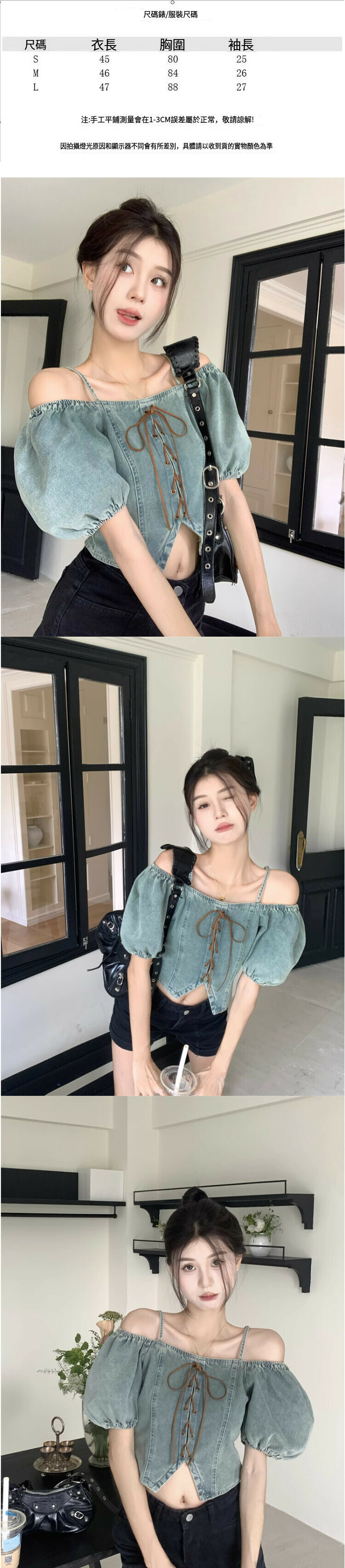 熱賣露肩泡泡袖牛仔襯衫【復古藍色】【S-L碼】(下單後請聯絡客服確認發貨尺碼)
