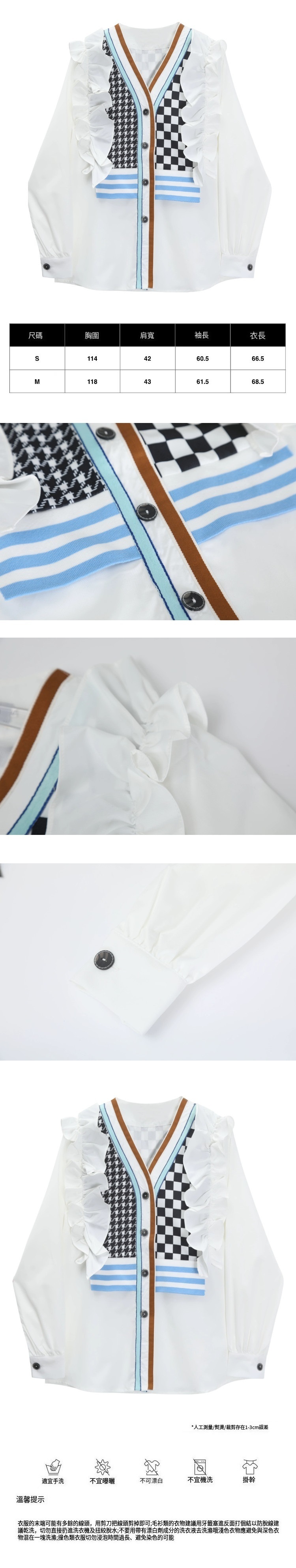 熱賣格子拼接撞色荷葉邊V領襯衫(白色)(S/M碼)(下單後聯絡客服確認發貨尺碼)