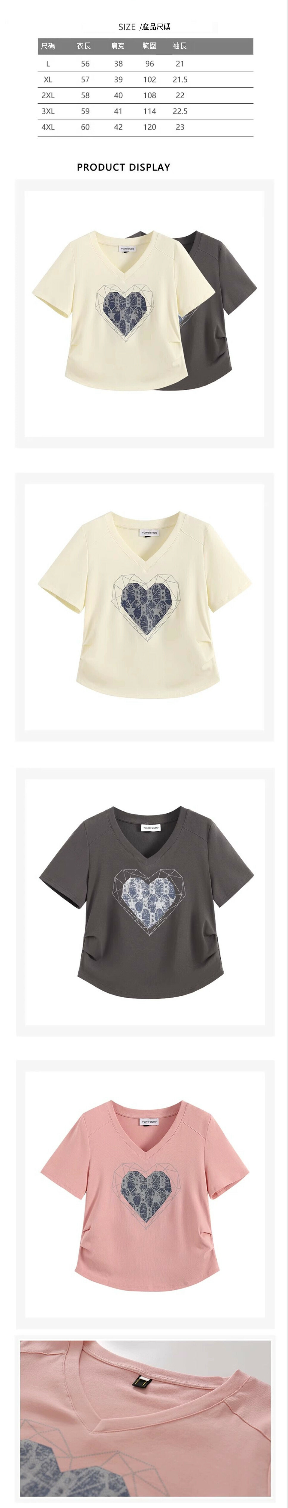 熱賣褶皺印花V領短袖T恤【杏色】【L-4XL碼】(下單後請聯絡客服確認發貨尺碼)