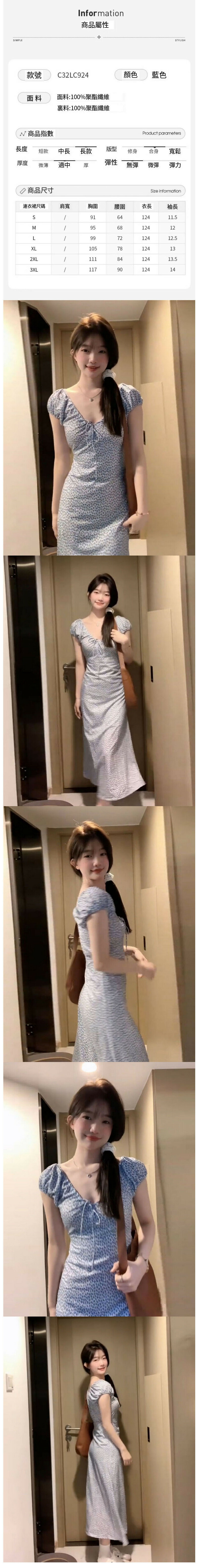 熱賣泡泡袖連衣裙(藍色碎花 S碼-XXL碼)(下單後請聯絡客服確認發貨尺碼)