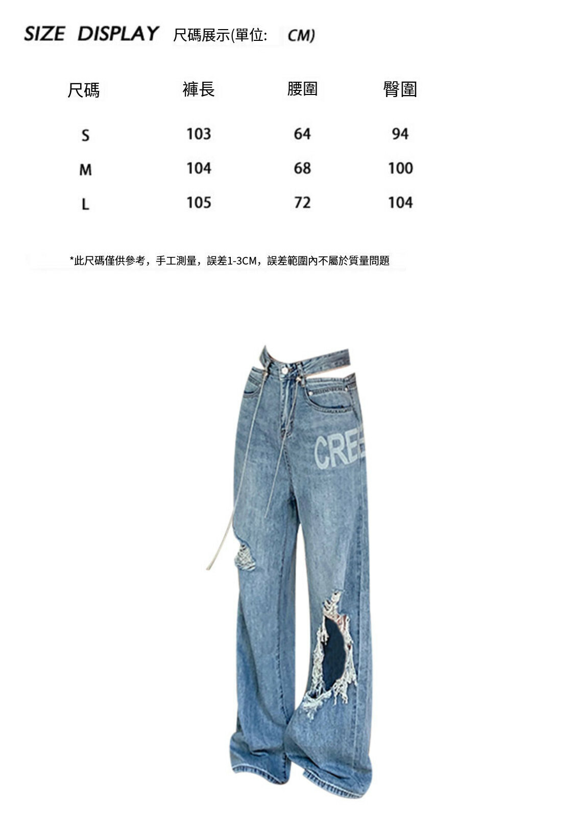 熱賣破洞牛仔闊腿褲(藍色 S碼-L碼)(下單後請聯絡客服確認發貨尺碼)