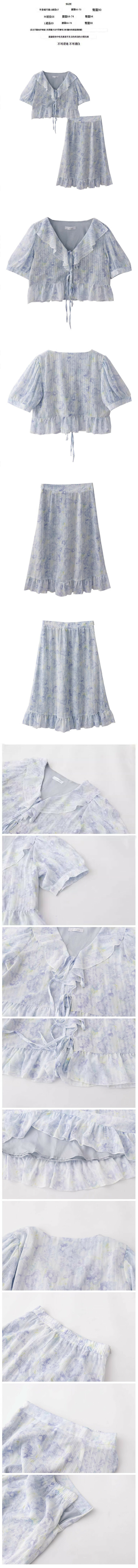 熱賣荷葉邊系帶碎花襯衫【藍色】【L碼】