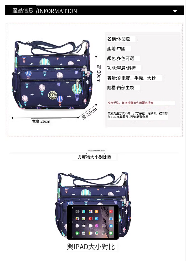 熱賣單肩包女 牛津布斜跨背包 輕便休閒時尚帆布多層包包【藍色熱氭球】