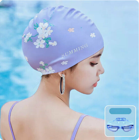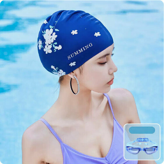 熱賣矽膠護耳泳帽泳鏡套裝(藏藍+泳鏡)
