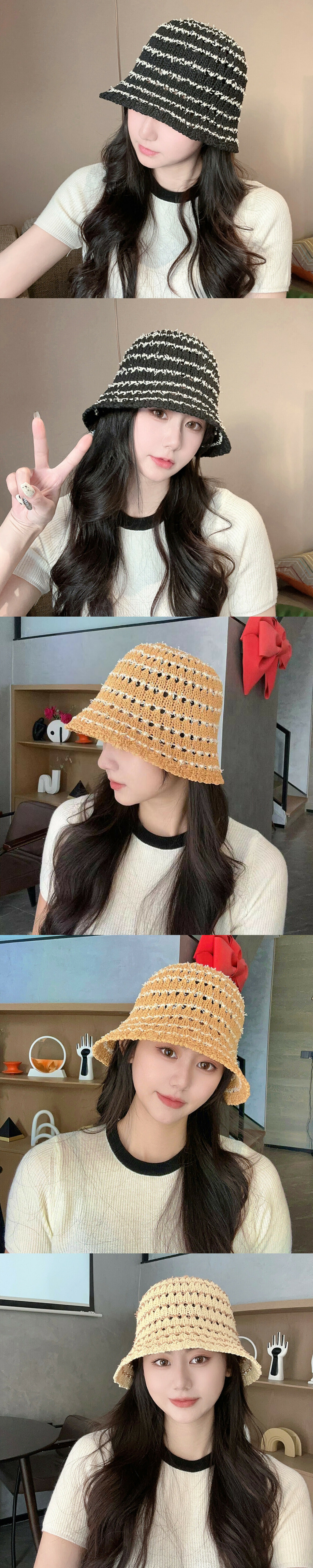 熱賣條紋水桶帽【D-258米白色條紋鏤空草帽】【L(帽圍58-60cm)】