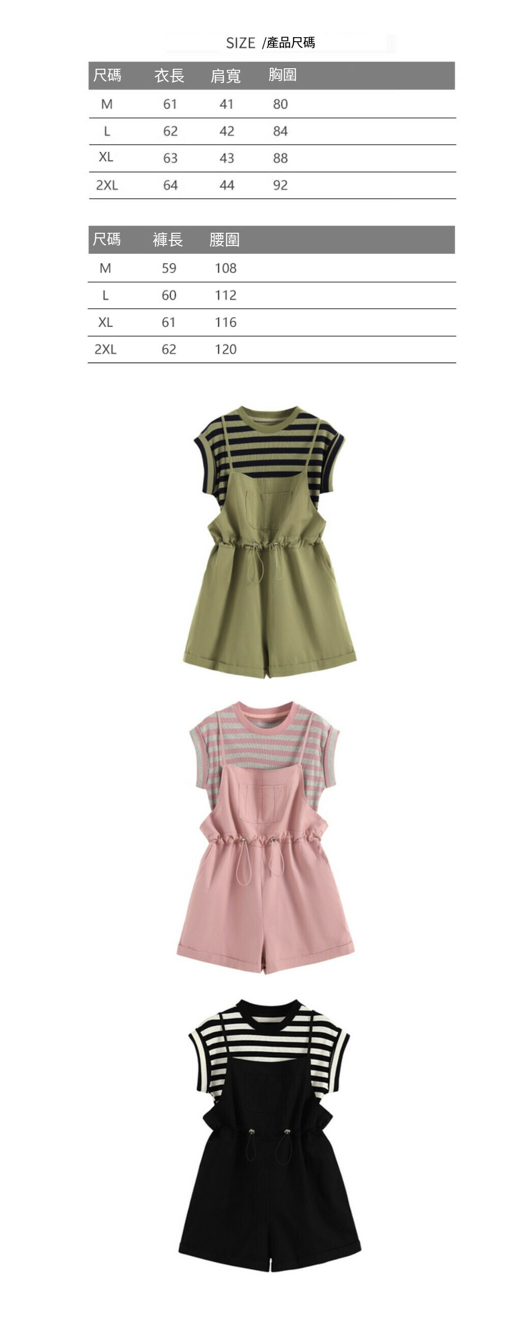 熱賣條紋短袖+背帶褲套裝【粉色】【M-2XL碼】(下單後請聯絡客服確認發貨尺碼)