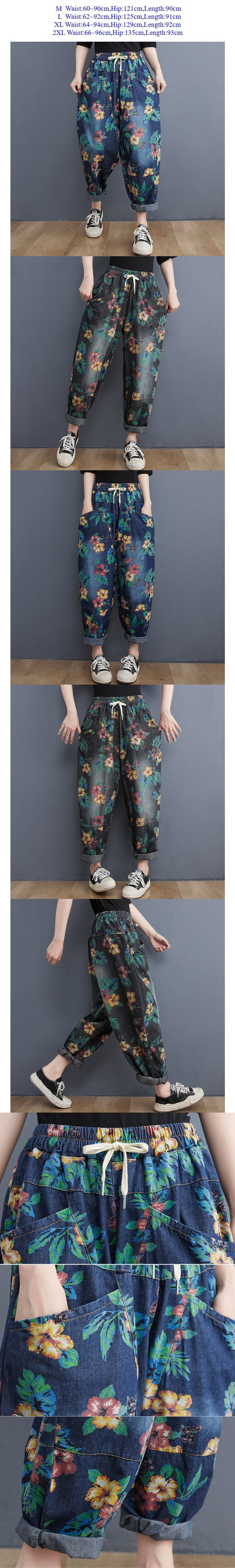 熱賣夏秋季休閒寬鬆牛仔褲復古碎花牛仔褲牛仔長褲哈倫褲(藍色)(M-XXL碼)(下單後請聯絡客服確認發貨尺碼)