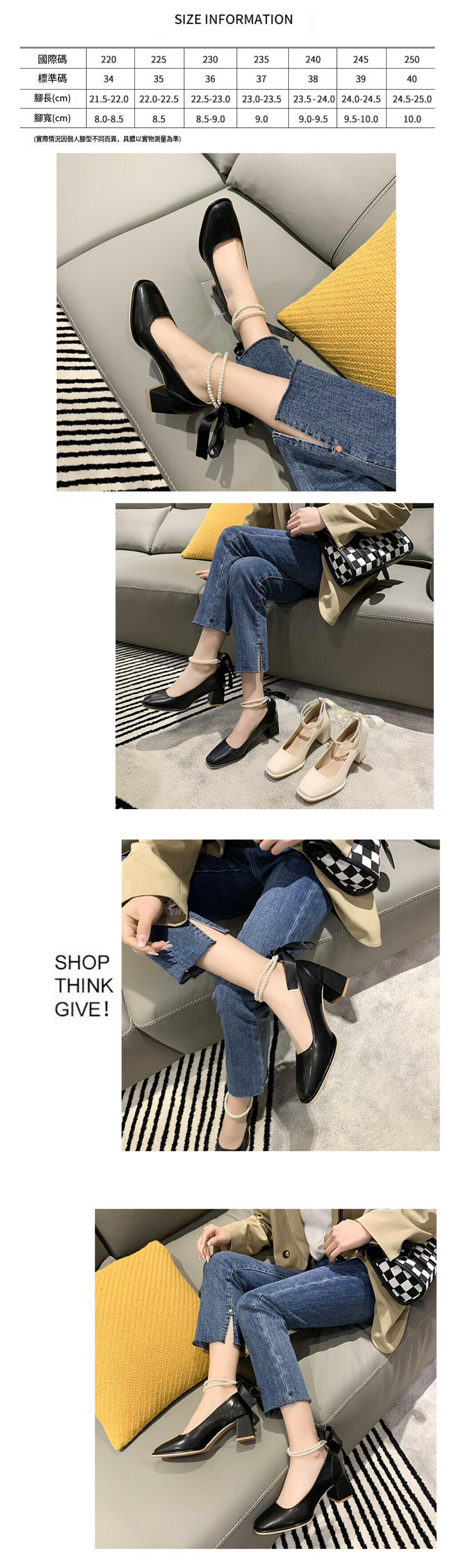 熱賣方頭粗跟珍珠單鞋【米色】【34-40碼】(下單後請聯絡客服確認發貨尺碼)