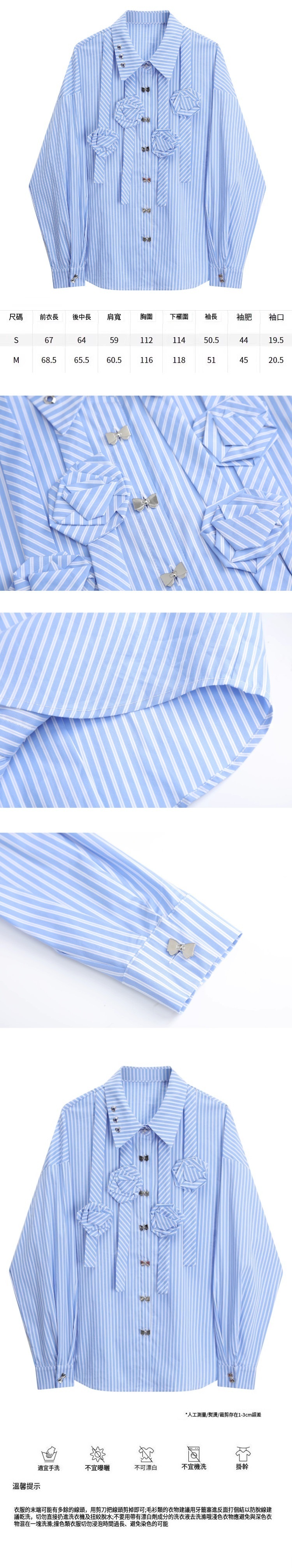 熱賣立體玫瑰花釘珠翻領長袖襯衫(藍色)(S/M碼)(下單後聯絡客服確認發貨尺碼)