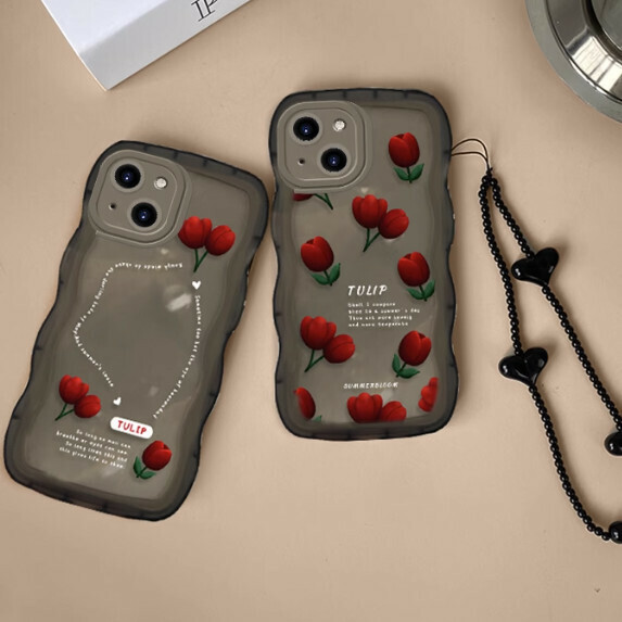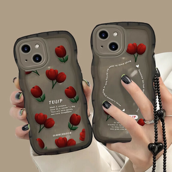 熱賣透黑波浪邊郁金香適用於OPPO_realme手機殼(波浪_滿屏郁金香+同款手鏈(下單後聯絡客服確認手機型號)