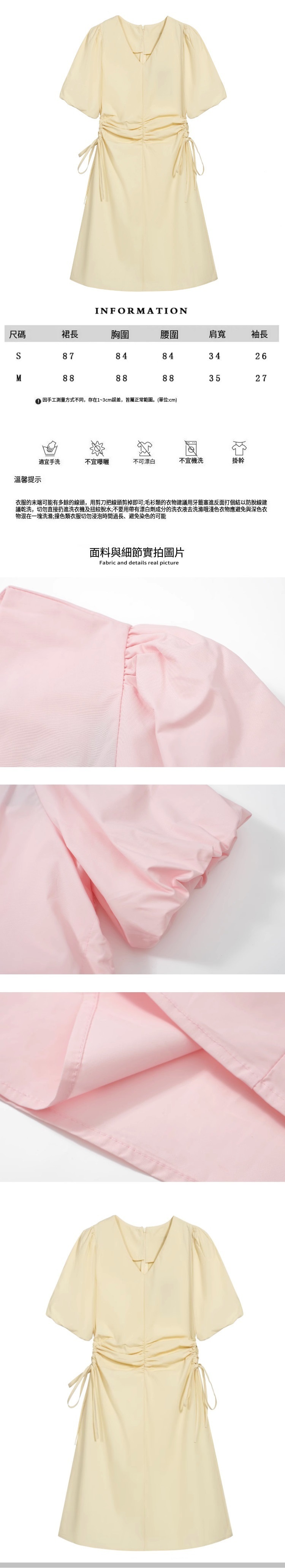 熱賣V領泡泡袖連衣短裙(淡黃色)(S-L碼)(下單後聯絡客服確認發貨尺碼)