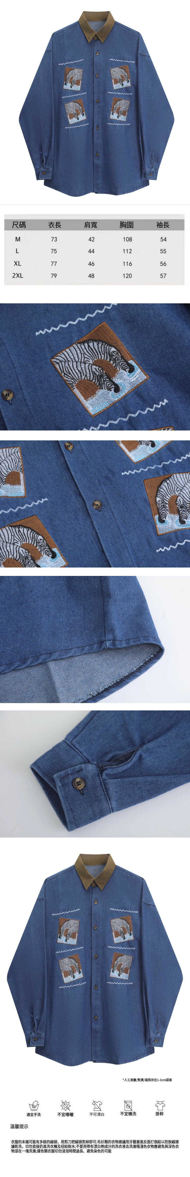 熱賣斑馬刺繡牛仔長袖襯衫(藍色)(S-XL碼)(下單後聯絡客服確認發貨尺碼)