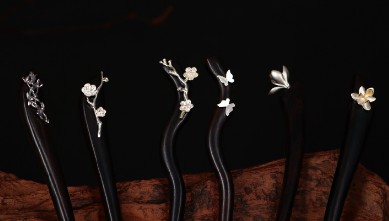 爆款古風簡約黑檀木配銀髮簪(半荷)(尺寸:長18.5cm)