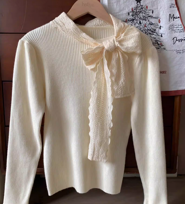 熱推蝴蝶結綁帶女秋冬打底衫針織上衣(杏色S-XL)(下單後聯絡客服確認發貨尺碼)