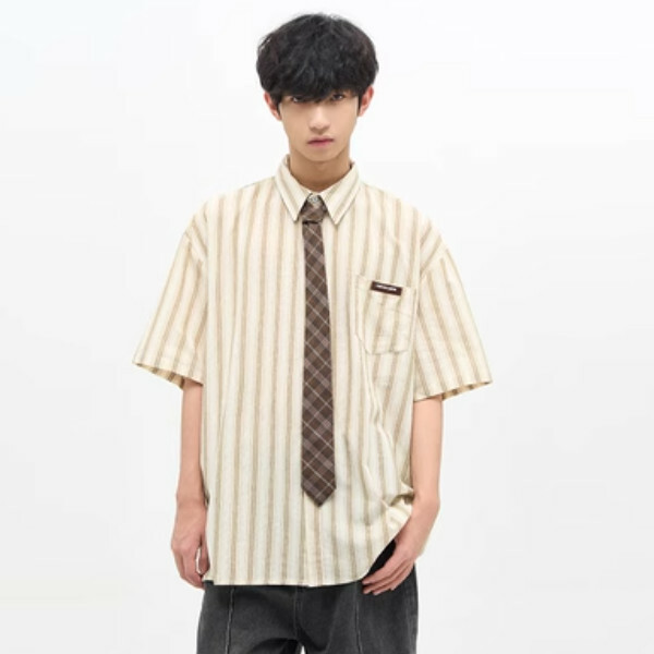 熱推學院風條紋情侶襯衫【杏色短袖S-XL碼,下單後與客服確認發貨尺碼】