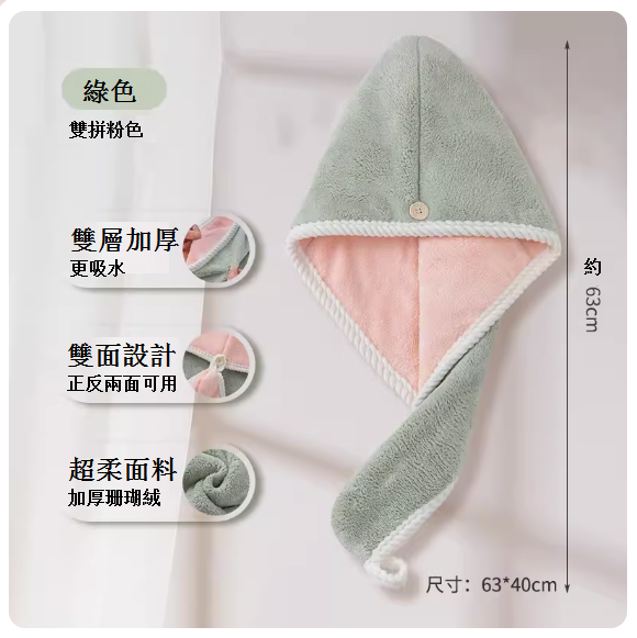 熱推珊瑚絨雙層加厚幹發帽【綠粉色】