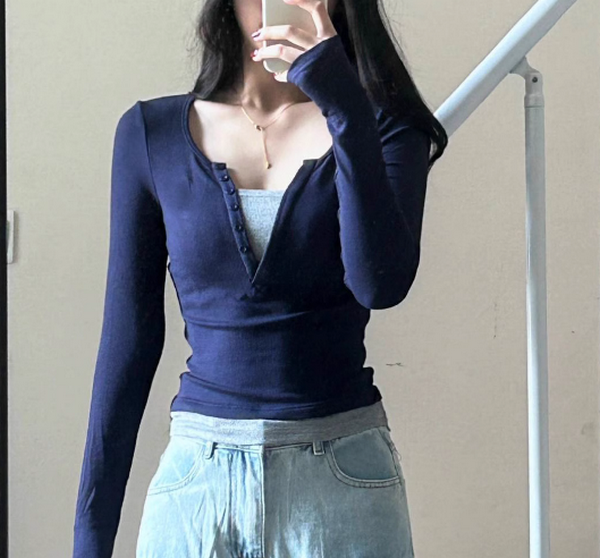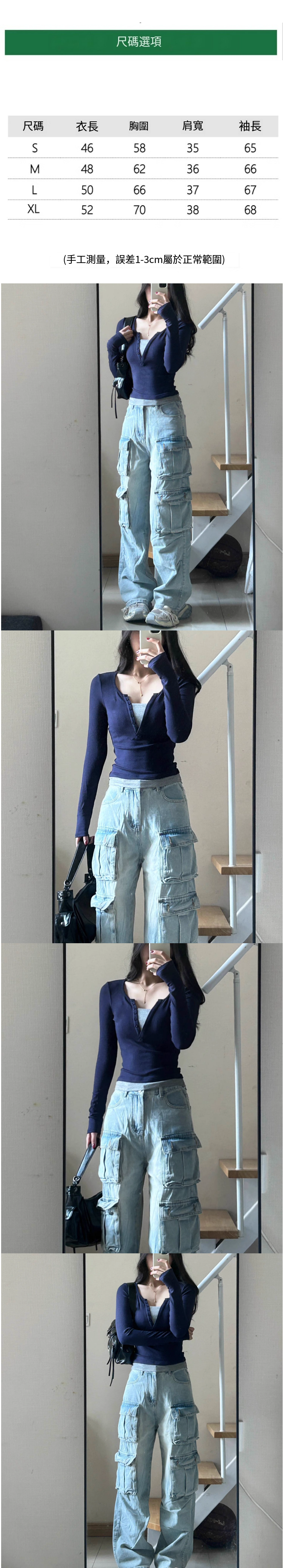 熱推假兩件正肩緊身長袖T恤(藏青色S-XL)(下單後聯絡客服確認發貨尺碼)