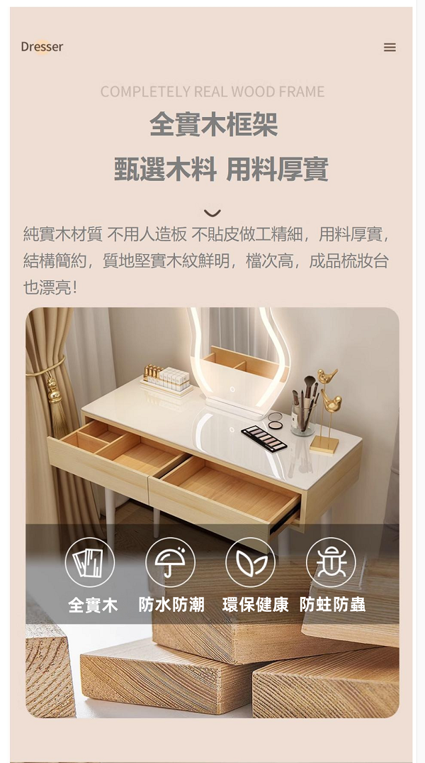 熱推法式奶油風實木梳妝台輕奢化妝台桌(全實木80+雲朵鏡+花瓣椅)
