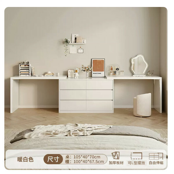 熱推日式組合 梳裝枱 電腦桌 衣櫃 書枱【105cm左桌+105cm右桌+100cm6抽櫃+化妝鏡+皮革凳】暖白色