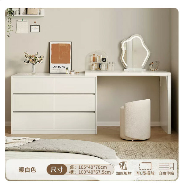 熱推日式組合 梳裝枱 電腦桌 衣櫃 書枱【105cm桌+100cm6抽櫃+化妝鏡+皮革凳】暖白色