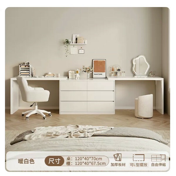 熱推日式組合 梳裝枱 電腦桌 衣櫃 書枱【120cm左桌+120cm右桌+120cm6抽櫃+化妝鏡+皮革凳+電腦椅奶白色】暖白色