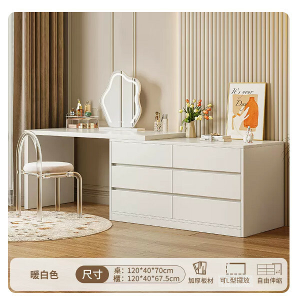 熱推日式組合 梳裝枱 電腦桌 衣櫃 書枱【120cm桌+120cm6抽櫃+化妝鏡+啞克力凳】暖白色