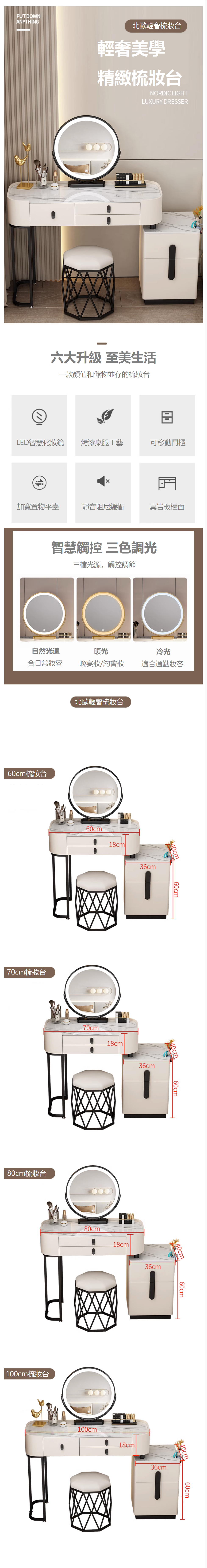 熱推輕奢梳妝台臥室現代簡約化妝台桌(黑白80岩板+岩板櫃+智慧鏡+花瓣椅)