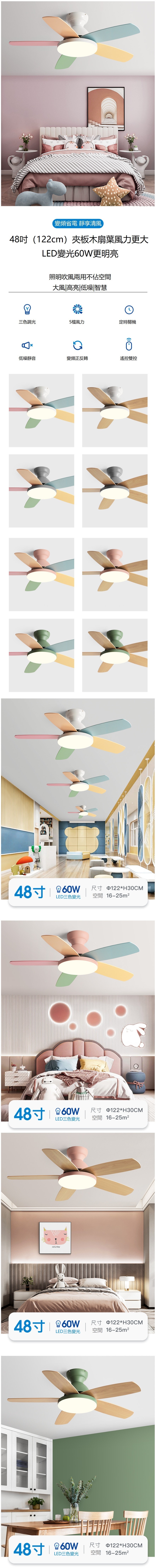熱推馬卡龍風扇燈吸頂吊扇燈(灰+彩葉48寸+變光60W+變頻遙控)